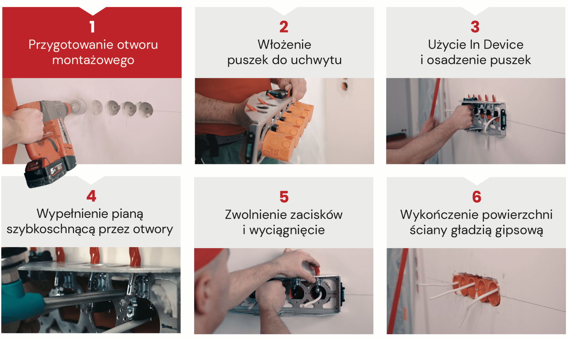 Wykonaj otwór, w którym osadzisz puszki. W zależności od liczby montowanych puszek wybierz odpowiedni Power Ad – dostępne są warianty dla dwóch, trzech, czterech i pięciu puszek. Wsuń puszki w gniazda Uchwytu i zatrzaśnij zaciski. Jeśli zajdzie taka potrzeba, możesz dodatkowo usztywnić mocowanie puszek, umieszczając wkręty w dodatkowych otworach mocujących. Przygotuj gips lub inną mieszankę montażową. Spryskaj otwór wodą. Nałóż do otworu niewielką ilość gipsu lub kleju. Używając Power Ad osadź puszki. Odczekaj kilka sekund, aby spoiwo zastygło. Zwolnij zaciski Uchwytu, jeśli używałeś też wkrętów – wykręć je. W przypadku montażu poziomego wykonaj Uchwytem kilka lekkich, posuwistych ruchów w górę i w dół. Jeśli montowałeś puszki pionowo — wykonaj ruchy na boki. Na koniec pianką montażową usztywnij osadzenie puszek.